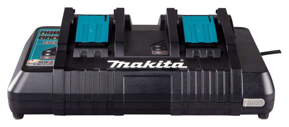 Szybka ładowarka do dwóch akumulatorów LXT® o napięciu 14,4 V i 18 V z mechanizmem suwakowym. Wyposażona w wentylator chłodzący akumulator, co pozwala na szybsze ładowanie. Ładowanie zoptymalizowane pod kątem napięcia, natężenia prądu i temperatury. Ładuje akumulator w ciągu 15 – 55 minut, w zależności od jego pojemności.