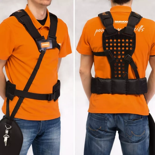 Szelki zwiększają komfort użytkownika, zapewniając optymalny balans ciężarku i lepszą kontrolę nad urządzeniem. Usztywniona część tylna szelek i miękki pas umożliwiają odciążenie kręgosłupa. Osłona biodrowa chroni użytkownika przed oddziaływaniem silnika.