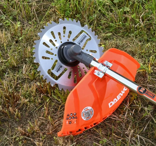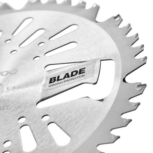 Niezwykle trwała i wydajna tarcza wyposażona w 40 zębów ze spieku twardego, w tym 8 szczególnie wytrzymałych zębów L-Type spawanych laserowo. 2 ostrza pośrodku tarczy służą do ścinania owijającej się trawy. Specjalne ostre krawędzie umożliwiają skuteczne cięcie wysokiej trawy.