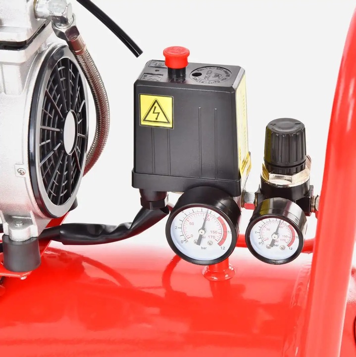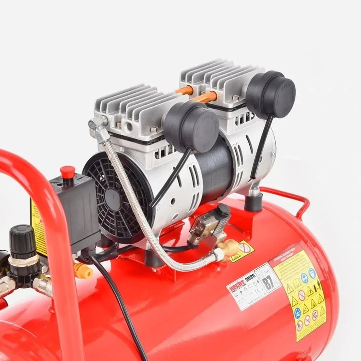 Sprężarka jest bardzo cicha. Prawdziwy hałas jest porównywalny z głośnością rozmowy między dwojgiem ludzi. Dlatego możesz nawet nie zauważyć, że kompresor jest włączony w garażu lub warsztacie.