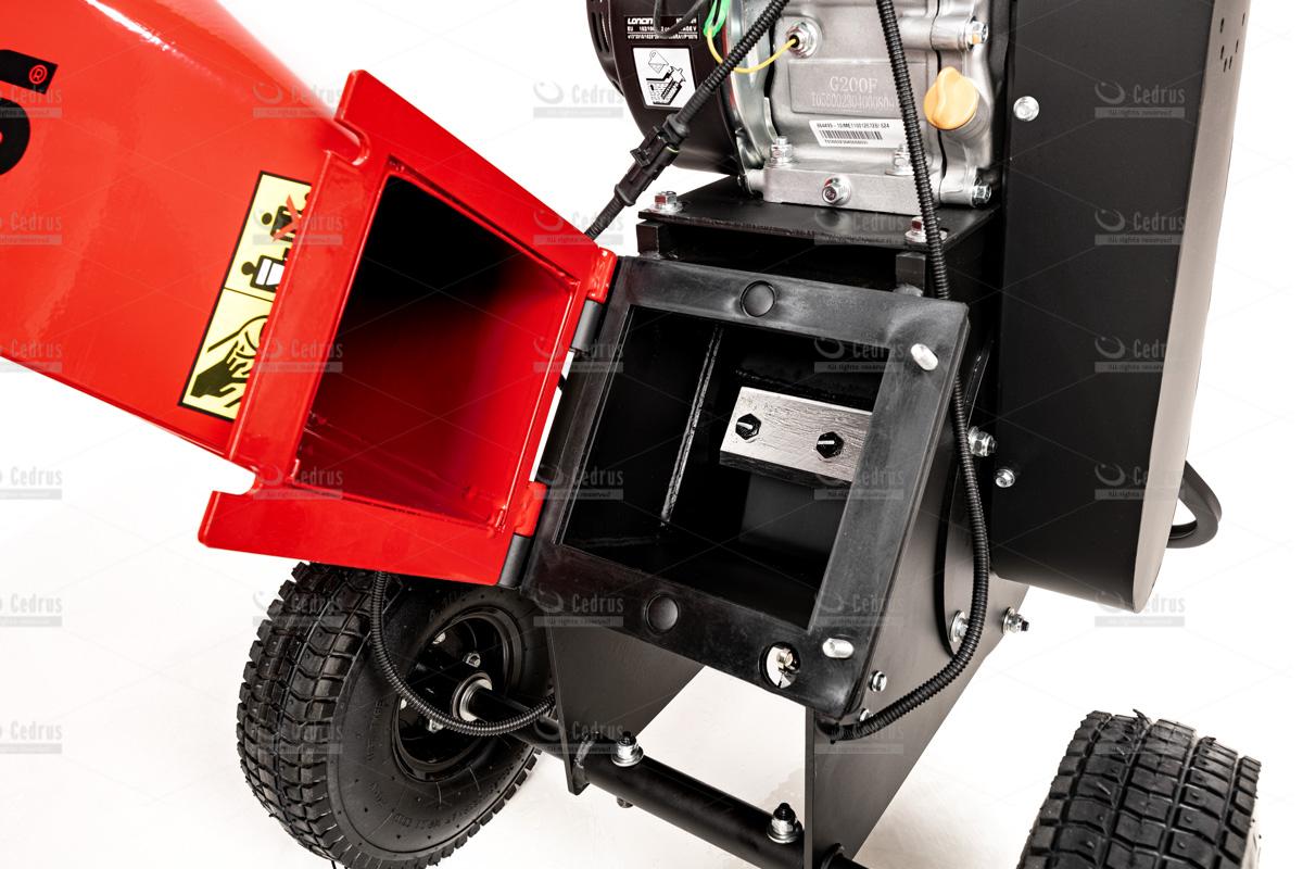 - szeroki otwór podajnika z gumą zabezpieczającą przed wyrzuceniem zrębka w stronę operatora,