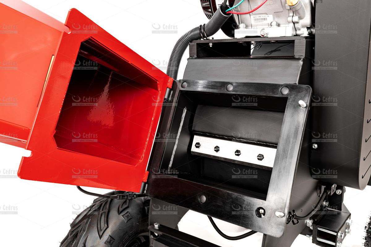 - szeroki otwór podajnika z gumą zabezpieczającą przed wyrzuceniem zrębka w stronę operatora,