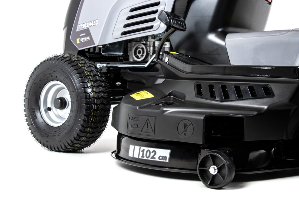 Dodatkowe udogodnienia, takie jak elektryczne włączanie noży agregatu tnącego i podnoszenie agregatu z poziomu kierowcy, sprawiają, że obsługa tego traktora jest niezwykle wygodna i intuicyjna. Min. promień skrętu wynoszący 45 cm zapewnia znakomitą manewrowość nawet na najwęższych ścieżkach.
